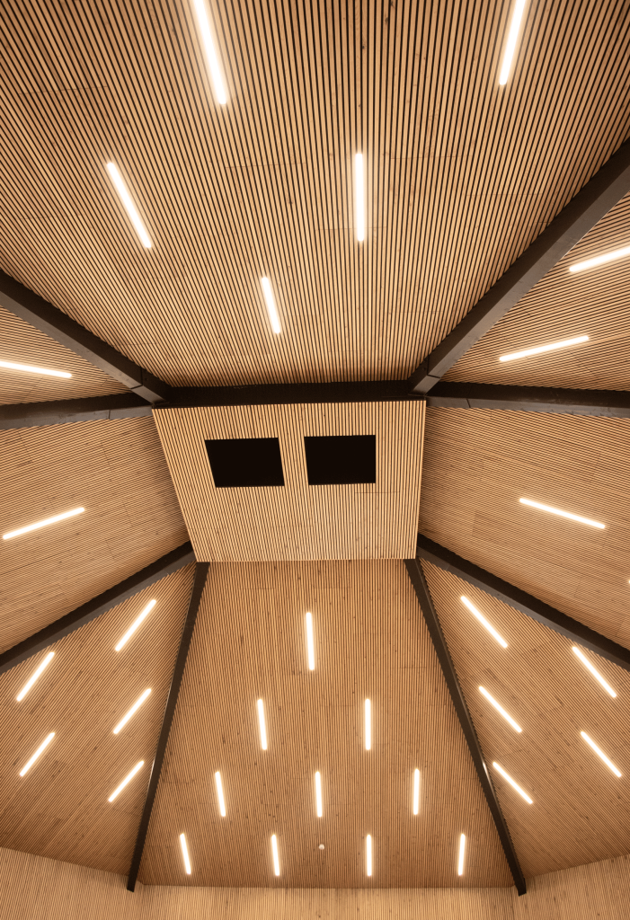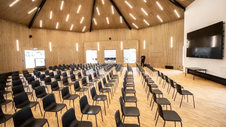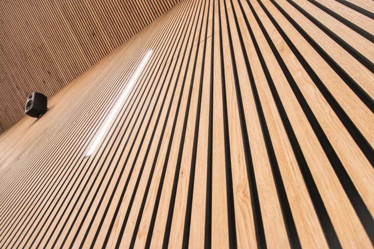 To enhance both the aesthetics and functionality of the space, the panels are tastefully installed on both the ceiling and walls of the expansive area. These panels not only contribute to the room’s modern and sophisticated look but also provide excellent acoustic solutions, ensuring sound quality is optimal for presentations and discussions. This thoughtful design creates a comfortable and effective environment, making it perfect for a wide range of professional events and gatherings.