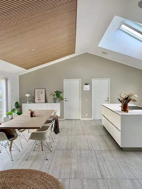 Melissa creatively used the panels in Classic Oak with Grey Felt to craft a beautiful gable, ceiling, and a headboard, achieving a cohesive and inviting ambiance throughout our home.