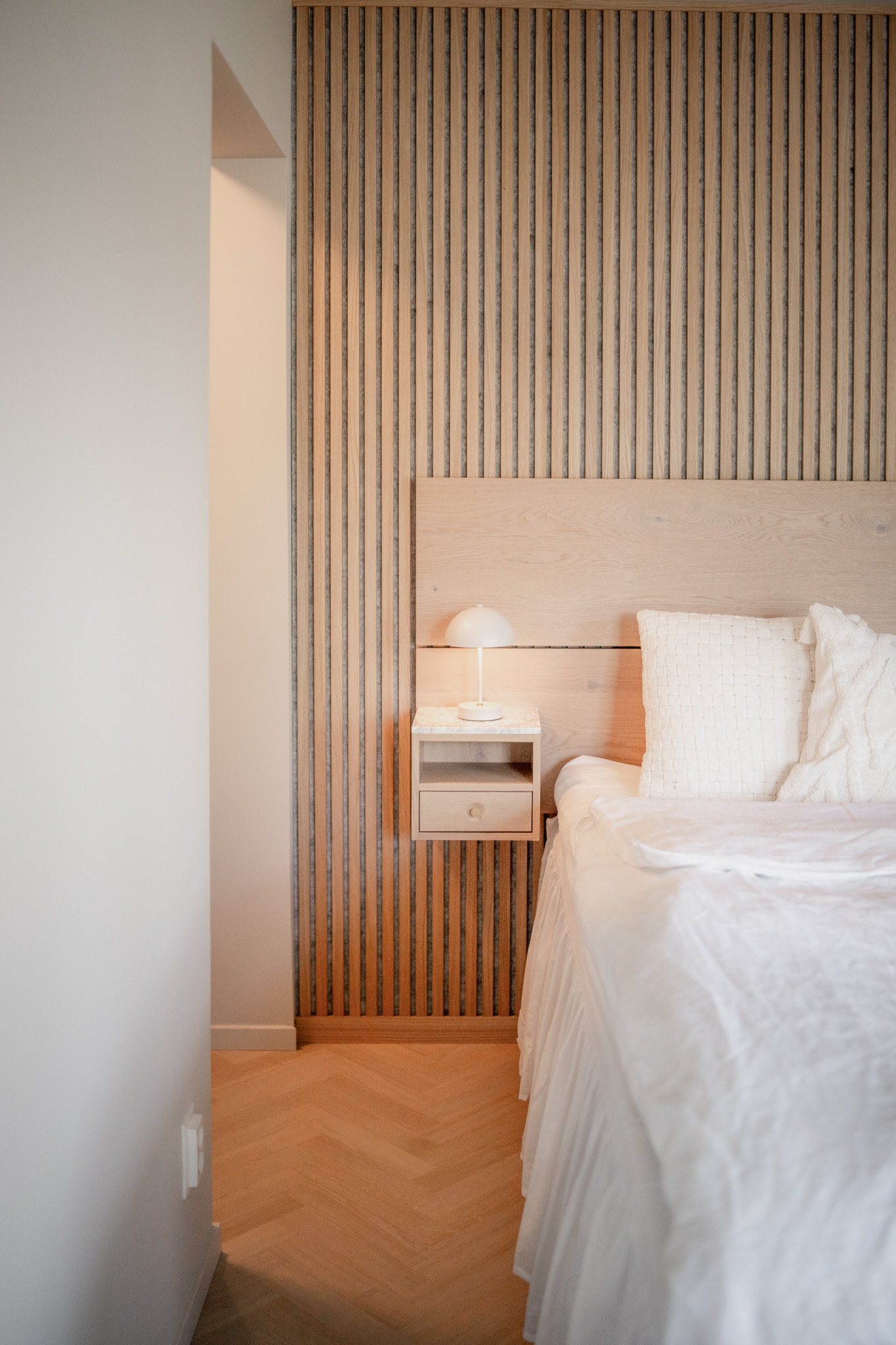 By adding a calming color palette, a few thoughtful details, and incorporating wood panels, they have transformed the bedroom into a warm and inviting space.