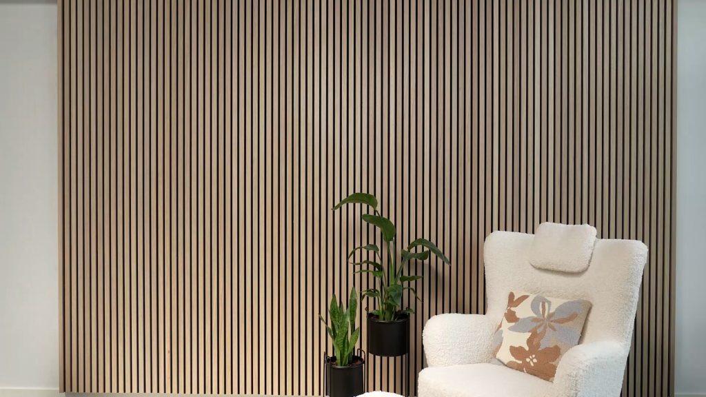For setting the right distance between akupanels, you can use a slat from a color sample. Make sure there is 13 millimeters between the panels as you attach them to the wall.