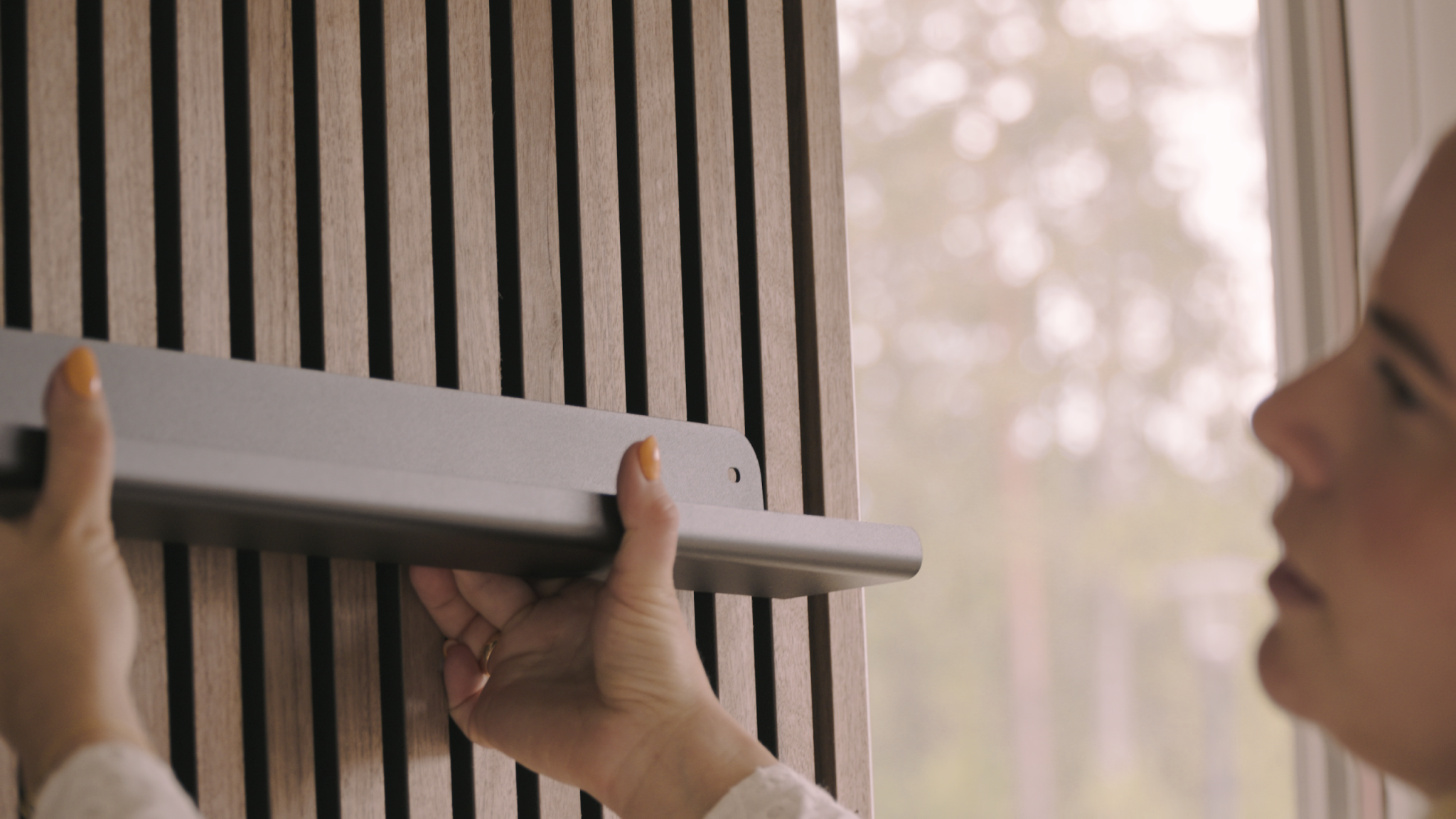In 2019, Martin was helping a client with acoustic issues and ordered WoodUpp samples. While flipping through a newsletter, he noticed horizontal panels with mounted shelves and thought, “Why not hang directly from the panels?”